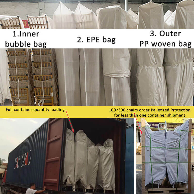 After inspected by our QC team, the white chiavari chairs will be well-packaged before delivery. There're THREE-layer packing materials to protect the chairs from scatching and damaging. The first one is bubble bags to keep the chairs away from each other. The second one is EPE bag for one stacking. Last but not least, a PP woven bag is covered the outlayer.